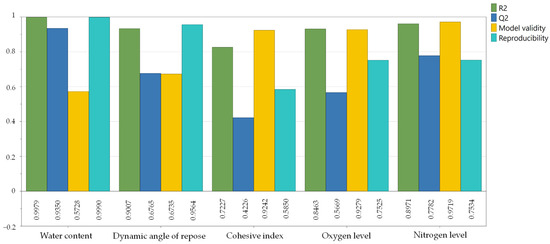 No significant model could be created for the cohesion index (CI). However, as this is directly correlated with the water content and the resulting moisture bridges, as shown in Section 1, it can be assumed that the reproducibility of the results is not sufficient to map the difference. An additional plot in Appendix A show the general correlation between flowability and water content.