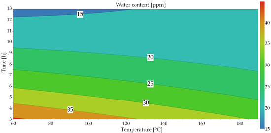 This equation was used to create a contour plot (Figure 8) based on the model prediction. This shows the water content as a function of both factors. This can be used to estimate the effect or the effect size of the two factors. Only the area covered by the tests is shown and the intermediate values are interpolated. An extrapolation of the values is associated with uncertainties due to the physical conditions [41]. At first glance, the result of the prediction looks plausible. The higher the temperature and the longer the time, the lower the water content of the powder. It can also be seen that time has a greater influence than temperature, which can also be recognized by the size of the coefficients. The non-linear relationship between the variables, which can be seen from the curved contour lines, is also clearly recognizable.