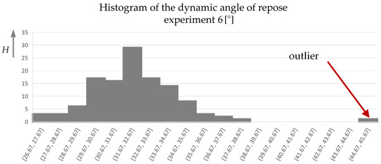 For this reason, histograms of the dynamic angle of repose over the absolute frequency (H) were created, which were used to remove isolated outliers (see Figure 9).