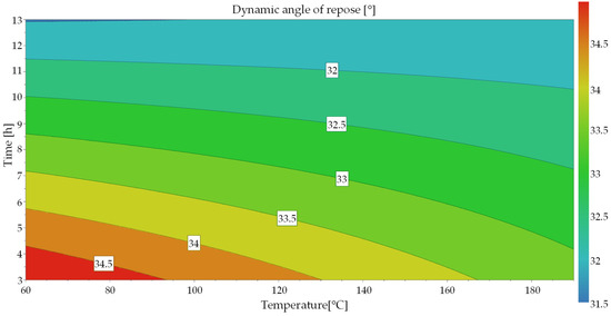 The response surface plot shows that the dynamic angle of repose is almost linearly dependent on time and temperature (see Figure 10). Similar to the water content, time has a stronger influence.