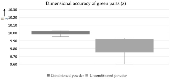 In order to validate the optimized powder conditioning in practice, test components were produced with unconditioned powder and powder that was dried using the method with the lowest water content. MBJ was carried out on a Digital Metal (now Markforged, Inc., Watertown, NY, USA) DM P2500 system using the C20 binder. The coating was applied via a blade system under vibration. The printing parameters are listed in Table 6: