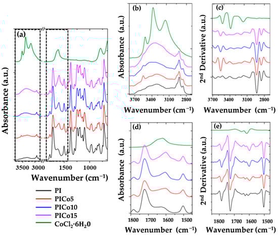 FTIR spectra of PI, CoCl2·6H2O, PICo5, PICo10 and PICo15 hybrid materials: 3700–700 cm−1 spectral region (a), 3700–2700 cm−1 spectral region (b) and its second derivative (c) and 1800–1400 cm−1 spectral region (d) and its second derivative (e).