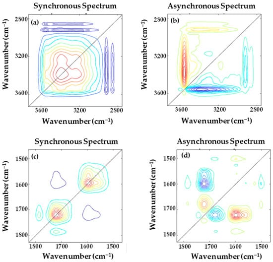 2D-COS spectra for 3700–2750 cm−1 region (a,b) and 1850–1400 cm−1 region (c,d) for PICo15 polymer film.