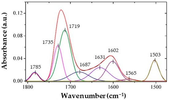 The IR spectra of the PICo15 sample were deconvoluted in the 1800–1400 cm−1 region according to the observed band in the asynchronous spectrum, using the method proposed by Niu et al. [70] (Figure 3).