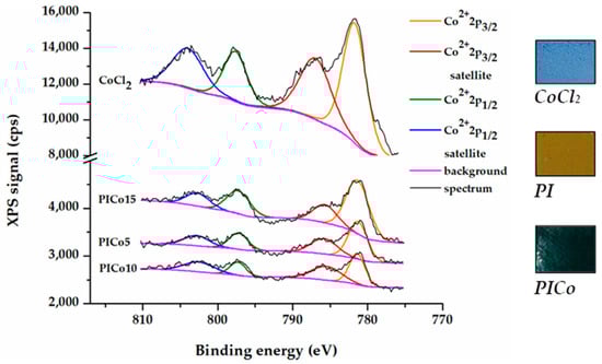 Deconvoluted 2p X-ray photoelectron spectra of CoCl2 and PICo5, PICo10 and PICo15 films. Images of the anhydrous CoCl2 and the polyimide films without (PI) and with additives (PICo) are on the right side of the figure.