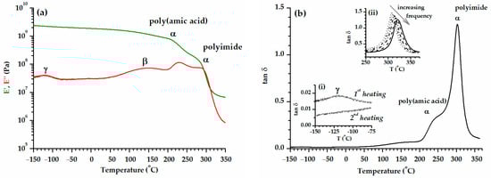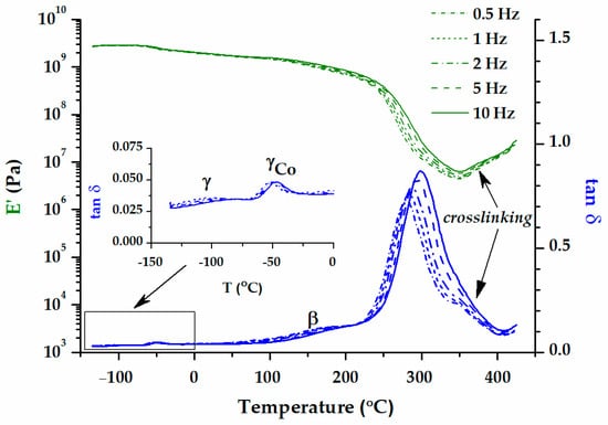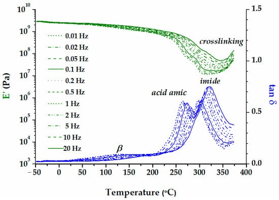 The characteristics of the viscoelastic parameters E′, E″ and tan δ during the glass transition region depend greatly on the polymer structure. The maximum value of the tan δ peak is higher than 1 (htanδ, Table 3). This is also reflected in the fact that E′ and E″ intersect two times during the α-relaxation (Figure 5a). Therefore, there are no constraints on the structure of the polyimide that would determine E′ > E″, i.e., a tan δ peak (htanδ) value smaller than 1. Also, the tan δ peak decreases with an increasing frequency due to the fact that no secondary processes overlap with the α-relaxation, which would confer additional mobility to the polymer chain [79]. The E′ modulus of the rubbery plateau remains constant until the end of the experiment.