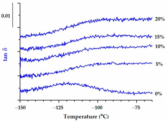 The viscoelastic behavior of the cobalt-doped MMDA-6FDA polyimide is presented below. At least theoretically, the cobalt can coordinate with both nitrogen and oxygen atoms, which belong to one or two polymer chains. In the sub-glass transition region, when compared with the viscoelastic behavior of PI, a shift in the γ-relaxation to a higher temperature (Figure 6) and the presence of a new relaxation around −40 °C (γCo, Figure 7a,b) are noticed. Figure 7a,b do not include the E″ modulus curves in order to keep the figures clear.