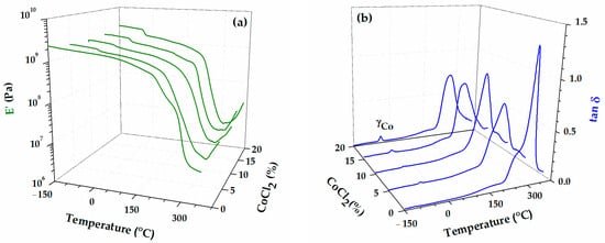 This shoulder does not have the characteristics of a relaxation (frequency-independent) [53,82] and occurs in the same temperature range as the E′ increase. The increase in rigidity is more intense and starts at a lower temperature, as the content in CoCl2 is higher.