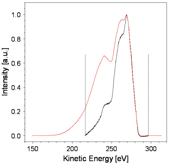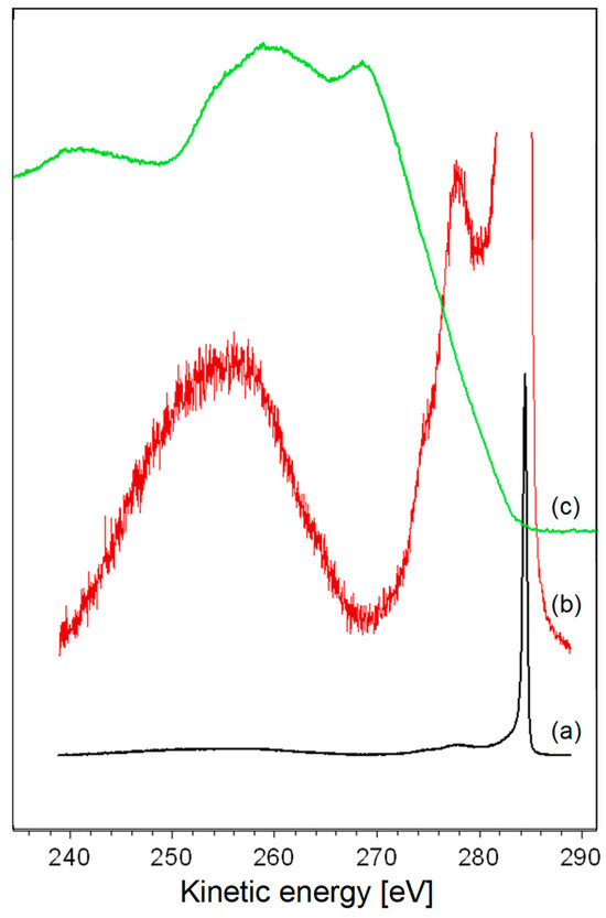 Despite these efforts, a common and significant challenge inherent in all these attempts stems from the convolution process. A first clue regards spectral alignment. In this work, we will use the loss feature excited by C 1s photoelectrons and the Auger spectrum obtained using the same spectrometer. Spectra are acquired on a highly oriented pyrolytic graphite exfoliated under vacuum to ensure a perfectly clean surface. C 1s and Auger spectra fall at rather different kinetic energies: the former is peaked at ~1202.2 eV, while the second falls in the binding energy range 280–240 eV. It is possible to align them on a common energy scale considering that the maximum of the possible kinetic energies of the Auger photoelectrons is obtained when the whole energy released by the relaxation of a valence electron into the C 1s hole (284.4 eV with our spectrometer) is absorbed by an electron at the Fermi level. This level in graphite corresponds to the top of the π band that falls at a null binding energy. As a consequence, the C 1s peak has to be placed at 284.4 eV on the kinetic energy scale of the Auger spectrum, as shown in Figure 1.