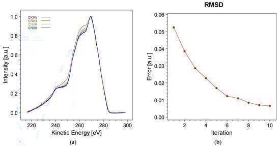 As evident from Figure 6a, increasing the number of iterations enhances the fidelity of reproducing the original spectrum. This trend is further illustrated in Figure 6b, where the root mean square deviation (RMSD) between the original Auger spectrum and the result obtained from the f n+1 ⨂ g convolution is plotted against the number of iterations. The RMSD decreases with each iteration, although the improvement in reproduction fidelity tends to plateau after the sixth iteration.