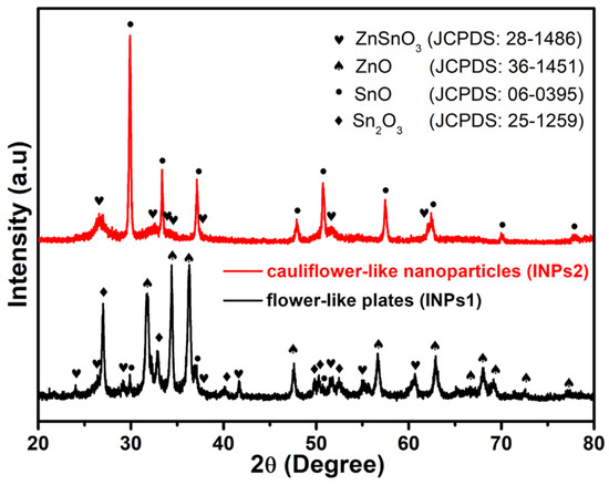 XRD measurements were used to identify the crystal structure and the various phases of these synthesized nanocrystals. The phase patterns obtained are presented in Figure 2. The corresponding X-ray diffraction patterns of as-synthesized flower-like plates (INPs1) are indexed to orth-ZnSnO3 (JCPDS: 28-1486) and SnO (JCPDS: 06-0395), indicating that the SnO phase dominates the nanoparticles. The corresponding diffraction patterns of as-synthesized cauliflower-like nanoparticles (INPs2) contain mixed phases of orth-ZnSnO3 (JCPDS: 28-1486), sub-valent tin oxide species (Sn2O3, JCPDS: 25-1259); SnO, JCPDS: 06-0395); and ZnO (JCPDS: 36-1451), indicating that ZnO and Sn2O3 dominate in the structure of the nanoparticles.
