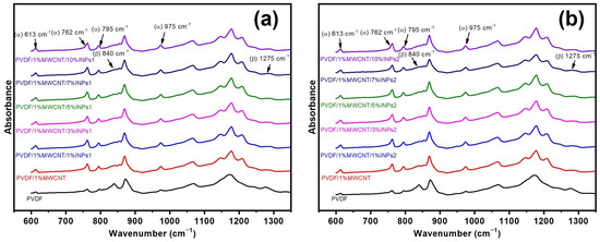 FTIR spectroscopy spectra results of pure PVDF, PVDF/1 wt% MWCNT, and PVDF/1 wt% MWCNT composites filled with different amounts of (a) flower-like plate nanocrystals (INPs1) and (b) cauliflower-like nanocrystals (INPs2).