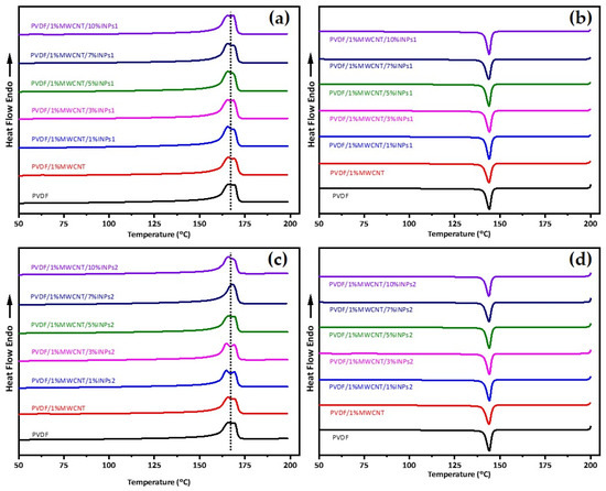 DSC heat flow curves of (a) first heating and (b) cooling for PVDF, PVDF/1 wt% MWCNT, and corresponding PVDF/1 wt% MWCNT with different amounts of flower-like plate nanocrystals (INPs1); (c) first heating and (d) cooling for corresponding PVDF/1 wt% MWCNT with different amounts of cauliflower-like nanocrystals (INPs2).