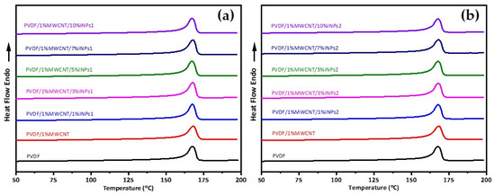 DSC was used to analyze the effect of MWCNT and synthesized nanoparticle addition on PVDF crystallization and evaluate their interactions. The corresponding results for the first heating and subsequent cooling curves from DSC are represented in Figure 4. It is observed that adding INPs to the PVDF/MWCNT composite does not lead to changes in the melting point and crystallization peak temperatures of PVDF. This phenomenon can be observed for both added INP types with different morphological features and phase characteristics. Furthermore, interestingly, this is also observed for all studied amounts of INPs. Therefore, adding synthesized INPs does not affect the crystallization and melting behavior of the PVDF composite. The second heat flow curves are given in Figure 5 and appear identical to the DSC results of the first heating.