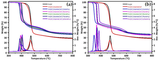 TGA was used to evaluate decomposition temperatures and, eventually, the stability of the produced samples in a specific temperature range. The TGA results in Figure 6 show that for both nanocomposites with different types of nanocrystals, the decomposition temperature was lower than that of pure PVDF and the PVDF/1 wt% MWCNT composite. It is observed that the addition of cauliflower-like nanoparticles (INPs2) significantly shifts the degradation of PVDF to lower temperatures, as seen in Figure 6b. The nanocomposites with 1 wt% INPs2 show the most significant influence, with a 120 K lower maximum degradation temperature than pure PVDF. In addition, this nanocomposite degrades slower than the samples with higher INPs2 amounts. However, it is seen that the maximum temperature of degradation increases again as nanoparticle content increases. The nanocomposite with 10 wt% nanocrystal INPs2 shows only a 100 K lower maximum degradation temperature than PVDF.