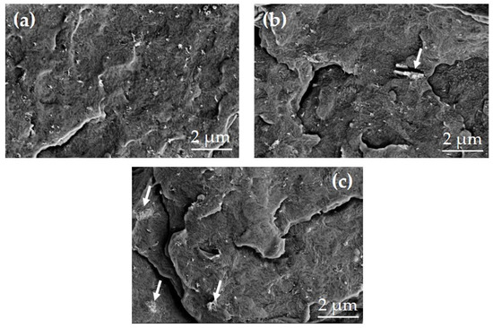 The microstructural features of the nanocomposites produced were analyzed using SEM. The structures of all the nanocomposites produced appear to be homogeneous, as can be seen in Figure 8. Some nanotubes protrude from the fractured surface, which looks similar in all three images. No large agglomerates originating from the added INPs can be recognized. It can therefore be assumed that the micrometer-sized structures seen in Figure 1 are at least partially broken into the larger platelet structures consisting of INPs1. One of these platelets of INPs1 can be seen in Figure 8b, while Figure 8c shows some small cauliflower-like segments of INPs2 marked by arrows.