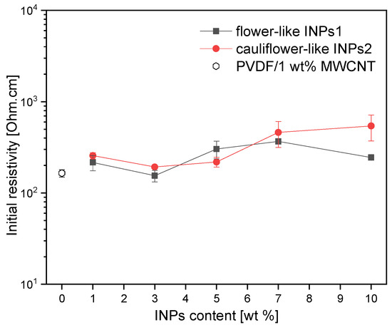 Figure 9 illustrates the influence of incorporating nanocrystals, ranging from 1 to 10 wt% in concentration, on the initial electrical resistivity of PVDF/1 wt% MWCNT composites. Incorporating nanocrystals can be interpreted as a mechanism to slightly obstruct the percolation pathways of CNTs, thereby enhancing interfacial polarization. This phenomenon is more pronounced by INP crystals exhibiting cauliflower-like nanostructures (INPs2).