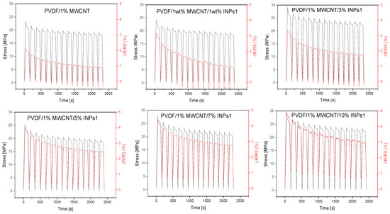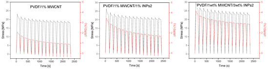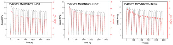 Results of cycling tests performed with 15 cycles up to 3% strain for PVDF/1 wt% MWCNT composites with cauliflower-like nanocrystals (INPs2) at different amounts (1–10 wt%).