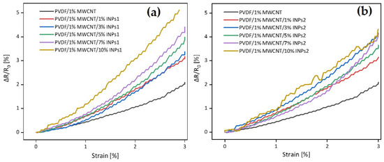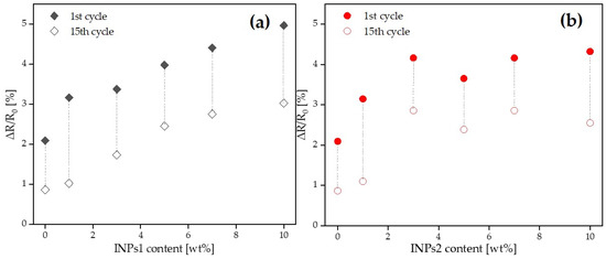 Figure 13 summarizes the variation in the maximal ΔR/R0 values achieved after the loading to 3% for PVDF/1 wt% MWCNT composites with INPs1 and INPs2 after the initial and final loading. The summarized plot again shows that ΔR/R0 increases more strongly with the INP content after the first loading for INPs1 and that the absolute decrease in ΔR/R0 after the 15th loading is on average more pronounced for composites with INPs1 than for those with INPs2.