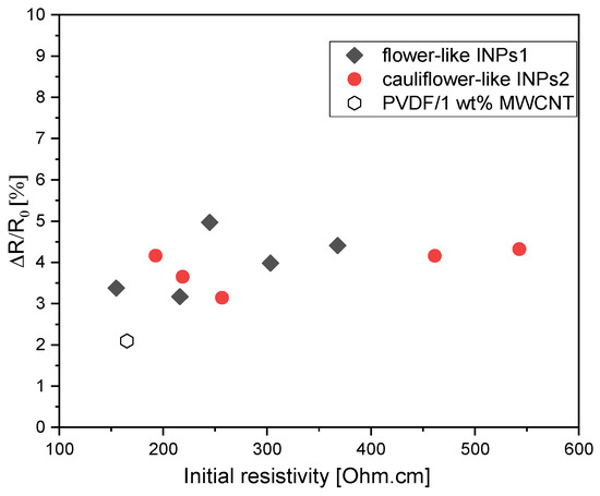 The question of whether the higher strain sensitivity of the composites with INPs1 is related to the slight differences in the initial resistivity between both composite sets (see Figure 9) may arise. It is well known that composites with filler contents closer to the electrical percolation threshold, i.e., with a higher initial resistivity, have a higher sensing response [47]. To prove that, in Figure 14, the measured relative resistance change after the straining part in the 1st cycle was plotted vs. the initial resistivity of all samples. Noticeably, the ΔR/R0 values of all composites with INPs are above the value of the PVDF/1 wt% MWCNT composite, which has nearly the lowest initial resistance. However, between nanocomposites containing INPs1 and INPs2, there is no significant difference in the ΔR/R0 values vs. initial electrical resistance. The two composites with INPs2, which have the highest initial resistivities, do not show the highest sensing sensitivity. The composite with 10 wt% INPs1 exhibited the highest sensitivity despite having an intermediate initial resistivity among all samples. This indicates that the higher piezoresistive response in composites with INPs1 is not due to higher initial resistivity values but to a slightly altered network structure of the conductive network, which is influenced by the addition of the platelet-like nanostructures and is more susceptible to strain changes.