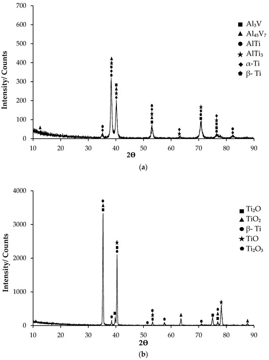 The chemical composition of Titanium Grade 5 alloy is listed in Table 1. Table 1 shows the X-ray fluorescence (XRF Rigaku ZSX Primus II; Tokyo, Japan) of the alloy by weight. X-ray diffractometry (XRD Rigaku Ultima IV; Tokyo, Japan) at 10–90° and 3°/min was used to determine the phases of the alloy. Analysis of XRD diffraction peaks was performed on an external PC connected to the device, MS Windows® Operating System, and SmartLab Studio-II software 2023.
