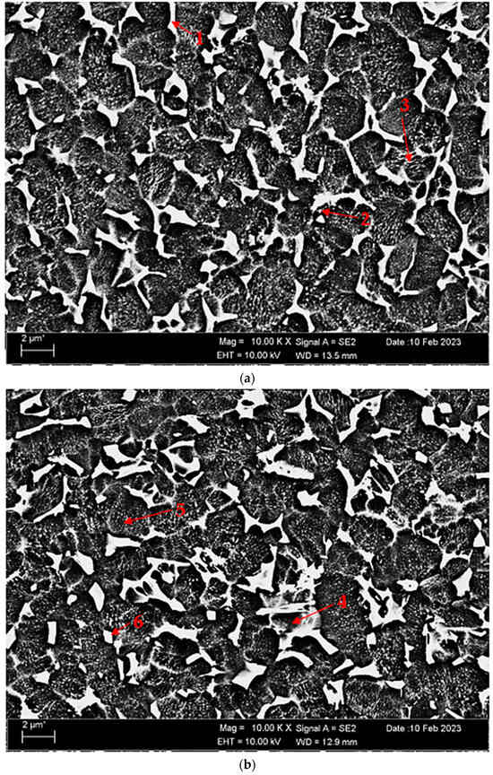 Figure 4a,b depict SEM micrographs of nonoxidised Titanium Grade 5 and oxidised Titanium Grade 5 alloys. Table 2 demonstrates the EDX analysis of the second phase with distinct morphologies labelled (1–6) in Figure 4a,b. When we look at the EDX analysis that supports the SEM analysis, it can be seen that alpha and beta Ti phases, which are also visible in the XRD analysis (See XRD (Figure 2a)), are present throughout the alloys. In the SEM of nonoxidised Titanium Grade 5 alloy, there is a rod-like structure with a white contrast colour at point 1. Since vanadium is minimal in these structures, these structures are likely Al3V. At point 2, sphere–ellipse-like structures are thought to consist of Al-Ti binary intermetallics. At point 3, there is a lamellar structure with white colour on grey contrast, and Al-Ti intermetallics are present here as well. In the SEM of the oxidised Titanium Grade 5 alloy, the presence of vanadium in a light grey contrast structure, which is quite visible and takes up a lot of space, at point 4 attracts attention. The presence of vanadium here is higher than in the nonoxidised alloy, and the structure is thought to consist of Al-V intermetallics. At point 5, the lamellar structure in the oxidation-free alloy has been replaced by a tiny, spherical, white contrast structure, and this structure consists of Al-Ti binary intermetallics. There are also Al-Ti phases in a rectangular-like structure at point 6. Several studies [40,41,42,43,44] have shown the natural occurrence of α2-Ti3Al and γ-TiAl intermetallic compounds in Ti-Al alloys that have a high concentration of titanium.