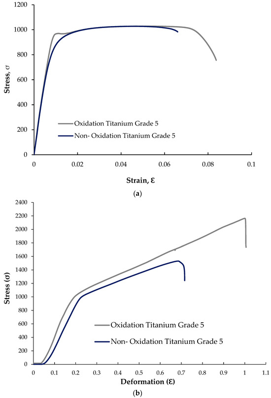 Tensile test results of nonoxidised and oxidised Titanium Grade 5 alloys are given in Figure 6a. As can be seen from the graph, oxidised alloy showed a better result compared to nonoxidised alloy. While the peak stress in the oxidised alloy was 1028.40 MPa, in the nonoxidised alloy, this value was 1027.20 MPa. It is seen that the peak stresses of both materials are close to each other, and the result of the oxidised alloy is slightly better. When we look at the breaking strain to characterise the deformation behaviour in the materials, it is 0.084 mm/mm in the oxidised alloy; in the nonoxidised alloy, it is 0.066 mm/mm. When we look at the stress at offset yield of the two alloys, it is 694.56 MPa in the oxidised alloy; it was found to be 674.09 MPa in the nonoxidised alloy.