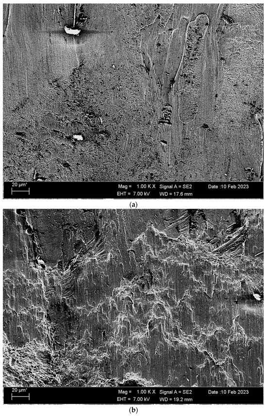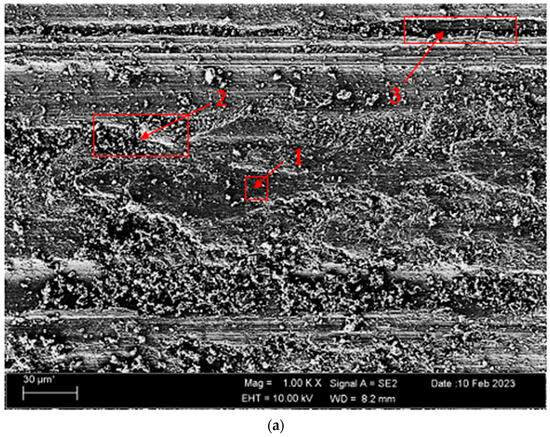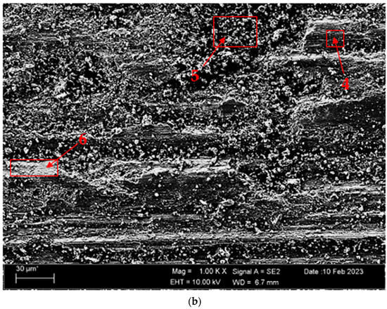 Abrasive and adhesive wear types are observed as the effective wear mechanisms in the SEM micrographs. The sticky wear type is in the form of adhesion of pieces plucking from the surface due to the adhesion of worn parts, and the adhesive wear type is more dominant in the wear mechanism. A noticeable rise in the oxygen peak was noted in the surface EDX study, indicating the presence of an oxidative wear process. The wear micrographs reveal that wear debris, which has been hardened by plastic deformation and oxidation (as indicated in Table 5), causes the development of wear grooves (as shown in Figure 10) on the surface of the tested sample during friction. This occurrence is indicative of abrasive wear. Also, the abrasion shows signs of the three-body abrasion’s efficacy, which is the sliding abrasion mechanism of the abrasive wear debris particle. As seen at point 1 in the nonoxidised alloy (Figure 11a), small particles broken off by the effect of wear are stuck to the matrix surface. At point 2, broken pieces can be seen densely plastered on the matrix surface. At point 3, a deep abrasive wear mark is observed. It can be seen that the wear grooves at point 4 in the oxidised alloy (Figure 11b) are not very deep. Swollen flakes in the form of sticky crusts are observed at point 5 due to adhesive wear. It is thought that the particles separated from the surface due to this flaking support three-body wear. At point 6, it is seen that the broken pieces are stuck inside the shallow wear lines. The formation of the oxide layer on the surface of the oxidised Titanium grade 5 sample leads to a shift in the wear mechanism from abrasive wear to adhesive wear. This finding is attributed to the somewhat greater peak of Ti and the presence of an oxygen peak in Table 5.