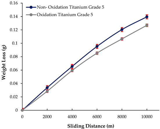 - According to their tribological properties, the oxidised alloy provides the least weight loss after 10,000 m and has the best wear resistance. The oxidised alloy experiences a weight loss of 0.127 ± 0.0002 g after sliding a distance of 10,000 m. Additionally, its wear coefficient is (63.45 ± 0.15) × 10−8 g/Nm. The unoxidised alloy exhibits the highest degree of weight reduction and the lowest level of wear resistance. The weight loss and wear coefficient, measured after a sliding distance of 10,000 m, is determined as 0.140 ± 0.0003 g and (69.75 ± 0.09) × 10−8 g/Nm, respectively. The oxidation process is shown to improve the tribological properties of Titanium Grade 5 alloy.