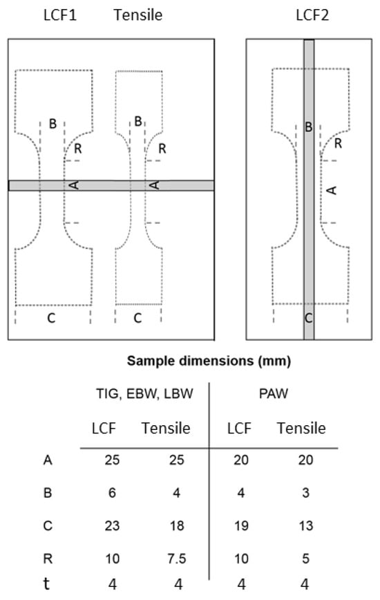 Schematic drawings and dimensions of the samples used for mechanical testing. Tensile and LCF type 1 specimens were perpendicular to the weld zone, and the LCF type 2 specimen was parallel to the weld zone.