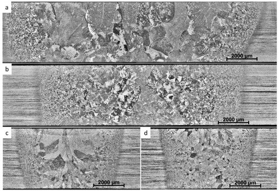 Microhardness profiles across the different weld cross-sections are summarized in Figure 5. In general, all four types of welds showed a similar trend. The hardness was found to be lowest in the base material and increasing through the HAZ, with the maximum hardness located in the fusion zone. The average hardnesses of the weld fusion zones are shown in Table 2.