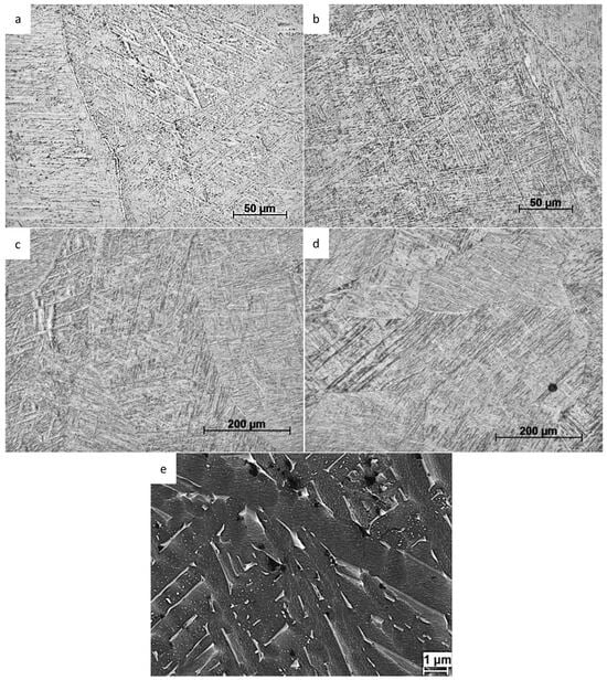 Optical micrographs of (a) TIG, (b) PAW, (c) EBW, and (d) LBW welds, and (e) SEM micrograph of PAW weld. The different magnifications can be noticed.