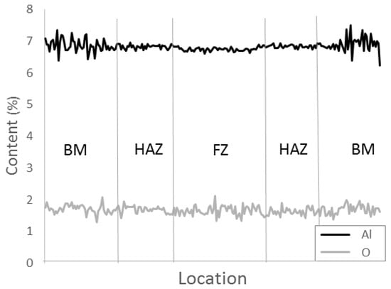 EPMA line scan across a TIG weld showing the distribution of aluminium and oxygen across the weld, i.e., in the base material, the heat affected zone, and the fusion zone.