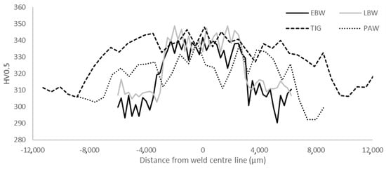 Microhardness profiles across welds produced by EBW, LBW, TIG and PAW after post weld heat treatment.