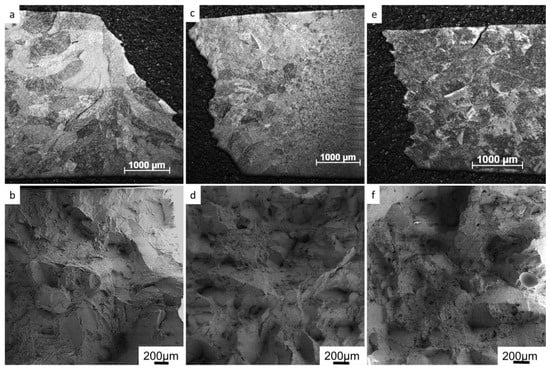 In all welded tensile test specimens, the fracture was located in the weld zones. In Figure 6, etched side views and the fracture surfaces of tensile test welds tested at room temperature are shown. In all welds, the fracture was found to be a combination of transgranural and intergranular fracture. Moreover, cracks were also observed along prior-β grain boundaries, and through prior-β grains outside the main fracture. Areas of intergranular fracture appear as flat areas in fractographs in Figure 6b,d,f. The shape and size of these areas correspond to the prior-β grains in the microstructure. Dimples were found in all areas indicating fracture through coalesced micro voids.
