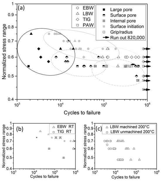 LCF results (a) for welds produced by TIG, PAW, EBW, and LBW at 250 °C; (b) EBW and TIG at room temperature; and (c) the effect of weld geometry in LBW. In (a,b), the shape of the symbol indicates the welding process, and the fill of the symbol indicates the type of initiation.