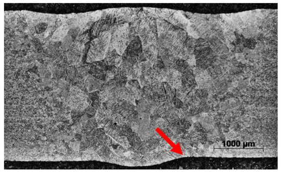 The LCF testing of polished and unpolished LBW specimens showed that the external weld geometry has a significant effect on the fatigue strength. The weld geometry of unpolished LBW is shown in Figure 8. Weld face underfill was found to be 80–100 µm, and root undercut 30–50 µm. As shown in Figure 7c, the machined samples had 5–10 times longer fatigue life compared with the samples with the external weld geometry retained. In the unpolished specimens, cracks always initiated at the weld toe on the root side and never at internal defects.