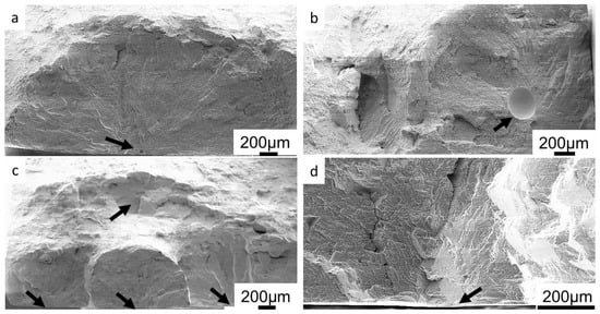 Fractographic investigation of LCF samples with lower fatigue life mainly revealed two characteristics: (i) fatigue crack initiation at a large pore in the center of the sample, or (ii) fatigue crack initiation at a pore located close to the surface of the specimen. Fatigue specimens with long fatigue life typically had crack initiation at the surface of the sample. Fracture surfaces showing typical crack initiation sites and crack propagation areas around them are shown in Figure 9. Arrows indicate the crack initiation sites.