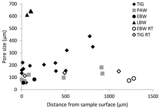 In Figure 10, the size of pores which initiated a crack, as well as their distance to the sample surface, are shown. Approximately half of the pores that initiated cracks had a larger diameter than its respective distance to the surface.