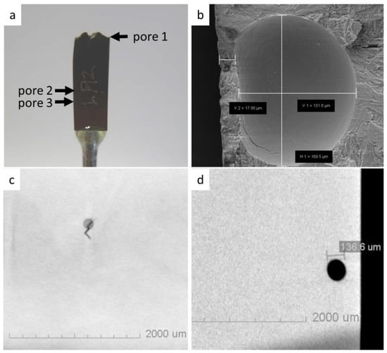TIG welded LCF specimen investigated with XRM: (a) overview of the fractured LCF specimen; (b) SEM fractograph of pore 1, which initiated the fatigue crack that led to failure of the TIG welded LCF specimen; (c) XRM virtual slice of the surface-breaking pore 2, with a diameter of 136 µm, which initiated a 300–400 μm long microcrack; and (d) XRM virtual slice of pore 3 which did not initiate a crack.