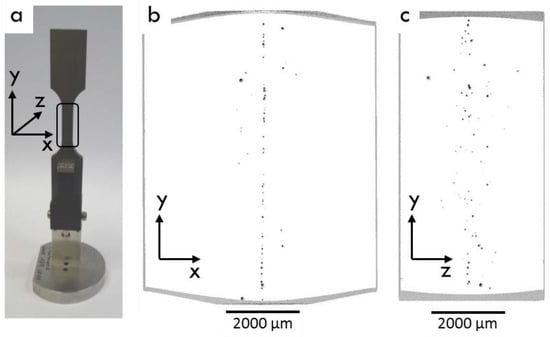 XRM 3D volume rendering showing distribution of porosity in a fatigue tested, but not fractured, LCF specimen produced by LBW: (a) overview of the LCF specimen, (b) view from top of the weld, x-y-plane, and (c) view from the side of the weld, y-z-plane.
