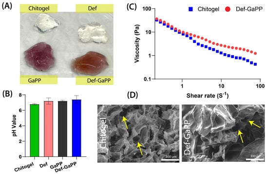 Characterisations of the Chitogel and Def-GaPP Chitogel. (A) Photograph of the final formulations. (B) The pH measurements of each formulation. (C) The shear rate against viscosity of the final Chitogel and Def-GaPP Chitogel. (D) The microstructure of the Chitogel and Def-GaPP Chitogel analysed by SEM, Yellow arrows indicate pores in the Chitogel structure, scale 300 μm.