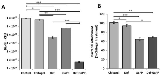 In vitro antibacterial analysis of the Chitogel, Def, GaPP and Def-GaPP treatment groups. (A) Quantification of P. aeruginosa biofilms CFU 24 h post-treatment with Def and GaPP Chitogels in a wound biofilm model. (B) P. aeruginosa biofilm attachment measured via crystal violet assay in response to treatment after 24 h compared with controls. Data are shown as mean ± SEM. * p < 0.05, ** p < 0.01 *** p < 0.001.