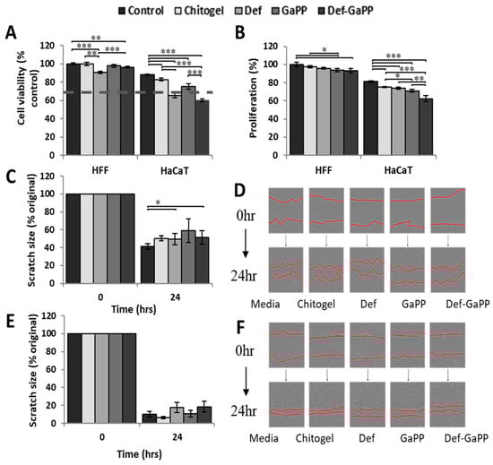 In vitro analysis of cell viability, proliferation, and migration in response to treatment with Def and GaPP Chitogels after 24 h. (A) Fibroblast and keratinocyte cell viability after 24 h treatment. (B) Fibroblast and keratinocyte cell proliferation. (C,D) The cell migration capacity of fibroblast at different time points with representative images. (E,F) The cell migration capacity of keratinocytes at different time points with representative images. The dashed line represents the industry standard cut-off for skin cell viability against biomaterials; viability above 70% is considered clinically safe for use. Data shown as mean (%) ± SEM. * p < 0.05, ** p < 0.01 *** p < 0.001.