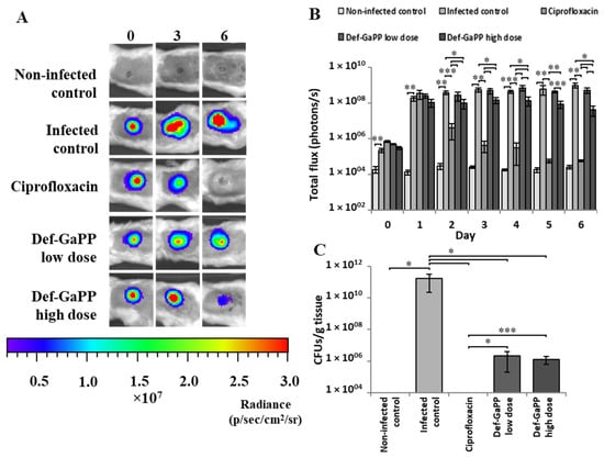 In vivo analysis of the P. aeruginosa (Xen41) biofilm infection wound model following treatment with Ciprofloxacin, Def-GaPP (5 mM–200 µg/mL) low dose, and Def-GaPP (10 mM–500 µg/mL) high dose over 6 days. (A) A representative bioluminescent image showing the progression of infection in response to treatment. (B) Quantification of bacterial burden expressed as the average total flux (photons/s). (C) Bacterial count from the wound tissue collected after the endpoint (day 6). Data shown as mean ± SEM. * p < 0.05, ** p < 0.01, *** p < 0.001, n = 8.