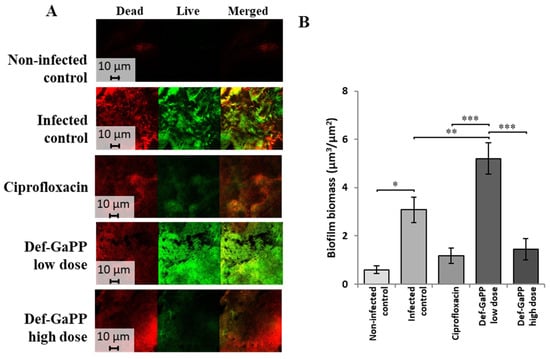 The bacterial biofilm collected from the wounds on the last day of the experiment was assessed using LIVE/DEAD BaclightTM stain (Figure 5A). The CLSM images show the distribution of mass of biofilms in response to all treatment groups. The green fluorescence indicates the presence of viable bacterial biofilms, while red is indicative of dead bacteria. The biofilm biomass was quantified following established protocols [24]. As shown in Figure 5B, Ciprofloxacin-treated wound biofilm biomass was significantly reduced compared with the untreated infected control and was not significantly different from the non-infected control, as predicted, suggesting a high inhibition rate (Figure 5B). The effect of Def-GaPP treatment on biofilm biomass was observed to be dose dependent. Wounds treated with low-dose Def-GaPP had significantly increased biofilm biomass compared with the infected control, antibiotic control, and Def-GaPP high-dose groups. A high-dose treatment of Def-GaPP resulted in significantly lower biofilm biomass compared with the infected control, and importantly no difference in the antibiotic control treatment (Figure 5B). This analysis further supports the strong efficacy of the combined Def-GaPP treatment to target bacterial biofilms and significantly reduce bacterial viability and biomass at the optimised concentration.