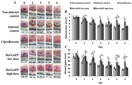 Analysis of wound healing in P. aeruginosa-infected wounds over 6 days of Ciprofloxacin, Def-GaPP (5 mM–200 µg/mL) low-dose treatment, and Def-GaPP (10 mM–500 µg/mL) high-dose treatment. (A) A representative macroscopic digital image of the wound site; the blue line represents wound area. (B) Wound area (mm2) over time. (C) Wound gape (mm) over time. Data shown as mean ± SEM. * p < 0.05, ** p < 0.01, n = 8.