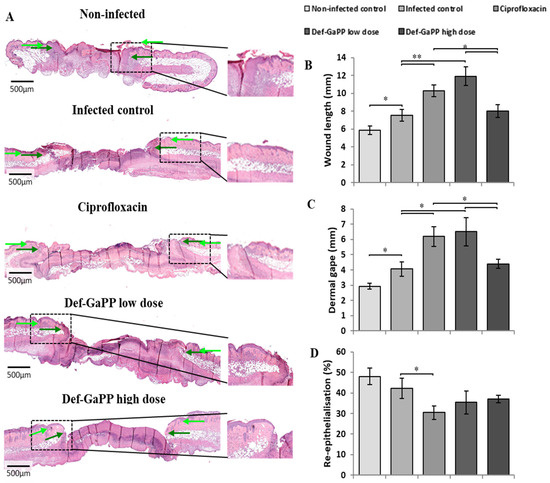 Histological analysis of wound healing was used for observing granulation tissue formation and assessing key features of wound healing, including wound re-epithelisation. (Figure 7A). Representative wound sections show the wound microstructure, where the green arrow indicates wound length (light green) and dermal gape (dark green). The results indicated that the rate of wound healing is consistent with the macroscopic data. The wound length and dermal gape for antibiotic and low-dose Def-GaPP treatments were significantly higher compared with other treatments, including high-dose Def-GaPP treatment. Additionally, high-dose Def-GaPP treatment showed no significant difference in wound length or dermal gape compared with infected and non-infected control groups (Figure 7B,C). Wound re-epithelialisation was not significantly affected by P. aeruginosa infection, however, ciprofloxacin treatment significantly reduced the rate of wound re-epithelialisation compared with the infected control (Figure 7D). The high-dose Def-GaPP treatment reduced infection and did not significantly impair or improve healing compared with the infected control, suggesting this dose is highly antimicrobial and safe for use against P. aeruginosa-infected wounds. Overall, this study suggests that, to achieve optimal healing, the combination of Def-GaPP at the optimised concentration is vital to support the wound healing phases without being non-toxic. Wound healing is impacted by numerous factors, including the duration of the healing [44]. This study focused on a relatively short duration of treatment, specifically 6 days, to assess the healing effect of the proposed treatment. However, it is important to acknowledge that, in the clinical setting, infected wounds often require more than 10 days to complete the healing process. The results imply that extending the study duration could yield even more favourable outcomes, potentially leading to accelerated closure of wounds with enhanced tissue regenerative capacity.
