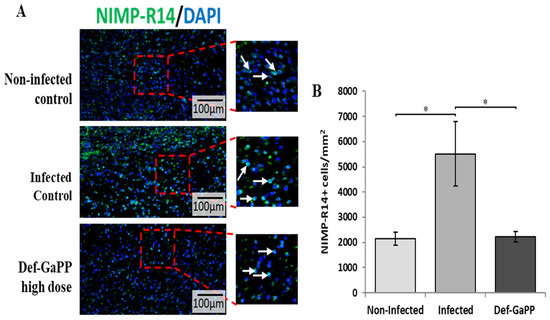 To further investigate the correlation between wound healing and inflammation, the wound sections were also stained for neutrophils and macrophages on the 6th day post-wounding. Studies to date have clearly demonstrated that delayed healing in chronic wound infection results in part from prolonged tissue inflammation [45,46]. In our study, the inflammatory response following the high-dose Def-GaPP treatment was investigated by analysing neutrophil infiltration within the wound bed and treatment effects on macrophage differentiation as an indication of the stage of healing. Neutrophil infiltration into the wound matrix was assessed as total number of NIMP-R14-positive cells (Figure 9A). At day 6, neutrophil infiltration into the wound bed was significantly increased in the infected control compared with the non-infected control. Importantly, Def-GaPP treatment of infected wounds significantly reduced neutrophil infiltration compared with the infected control, showing similar levels as the non-infected control (Figure 9B). Neutrophil infiltration is highest during the inflammatory phase of wound healing [44,47]. Lower neutrophil numbers in the Def-GaPP-treated wounds indicate that Def-GaPP reduced the inflammation caused by P. aeruginosa infection, and this agrees with previous studies that showed that topical Def treatment has strong anti-inflammatory and antioxidant properties in cutaneous wounds [48].