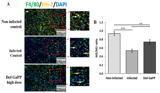 To verify the function of Def-GaPP treatment in macrophage polarisation in vivo, immunofluorescence staining of M1 and M2 macrophages was analysed using F4/80 and Ym-1 markers to determine the anti-inflammatory M2/pro-inflammatory M1 ratio. Normally, the M1 macrophages would be the predominant macrophage phenotype at early stages of wound healing and in response to infection, while the M2 macrophages usually peak in later stages, around day 7 after injury, and increase in numbers once infection is cleared. Here, the representative images of F4/80/Ym-1 double-staining showed a high distribution of orange double-stained macrophages (yellow arrows) indicative of a high M2 macrophage phenotype count in response to Def-GaPP Chitogel treatment (Figure 10A). The quantitative analysis demonstrated a notably elevated M2/M1 ratio in the presence of Def-GaPP treatment compared with the infected control (Figure 10B). This indicates a significant anti-inflammatory effect of the Def-GaPP Chitogel treatment, contributing to the clearance of infection and acceleration of the wound healing process. As anticipated, the M2/M1 ratio was also higher in response to the non-infected control due to the absence of infection and a similar wound healing profile to the treated infected groups. Meanwhile, the level of M2/M1 was the lowest for the untreated infected groups, suggesting the presence of inflammation and delayed healing.